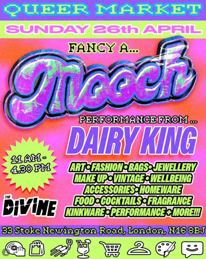 as our spring Mooch performer… trust us, this is not to be missed. 🍼🥛🐄🐮 … And check out this stunning brilliant gorgeous line-up of queer creatives, makers, artists, and independent businesses!