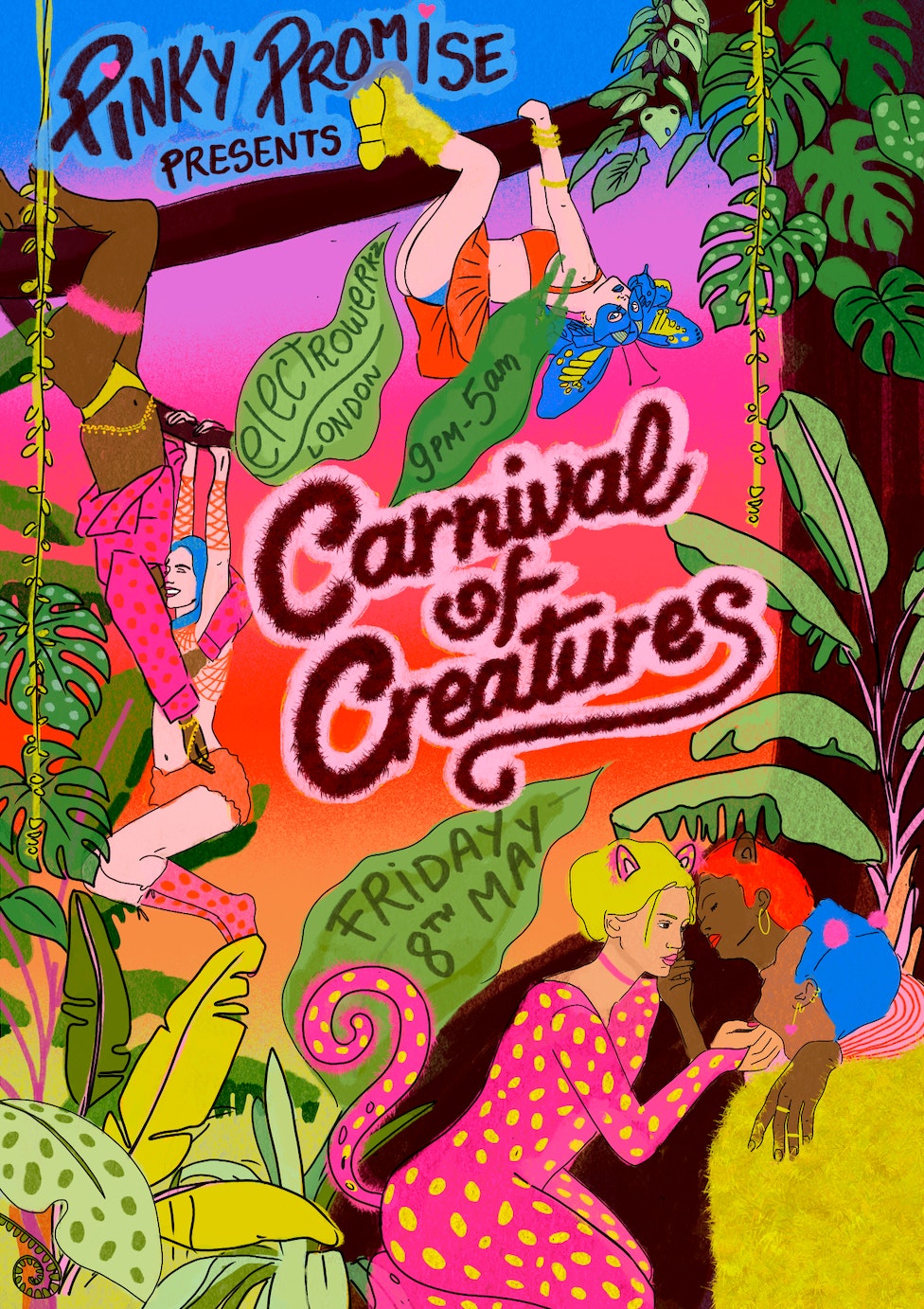 The Great Naturalist has turned his lens toward the most exquisite species of all: you! To celebrate the legendary David Attenborough's 100th birthday, Pinky Promise invites you to the Carnival of Creatures! A nocturnal migration into the deep, wet & wild heart of the jungle./n/nSpread across six lush realms, our delightfully overgrown bush invites you to immerse yourself in the raw & pheromonal energy of the untamed. Whether you dare to dive deep in the Orchid’s Throat, get sweaty in the Serpent’s Nest or explore fluid intimate connections in the Bioluminescent Basin, every inch of this habitat is crafted to heighten your senses to gasping new heights./n/nCome alone or entwined with your pack as this is a celebration to howl with beasts, toy with temptation and surrender to the sublime!/n/nIMPORTANT INFORMATION: The venue requires you to have a VALID physical photo ID to enter (photocopies cannot be accepted)./n/nDJ LINEUP: Renee - Lagoon - Harpriya - Philippo - Blissy E - Mimi Rich - Bad Pal Lilli/n/nWORKSHOPS: Art of Tease (Adreena Angela) + Sassy Strip & Tease (Bethany Sassy) + Performing with Pride (Bwyan the Lion)/n/nDRESS CODE: NO EFFORT - NO ENTRY! Our dedicated team of costume checkers will be at the entrance checking outfits./n/nACCESSIBILITY: Please refer to our website where we have an accessibility document for the event & venue. Please note that only the ground floor is fully accessible, there are 2 more floors that can only be accessed by stairs.